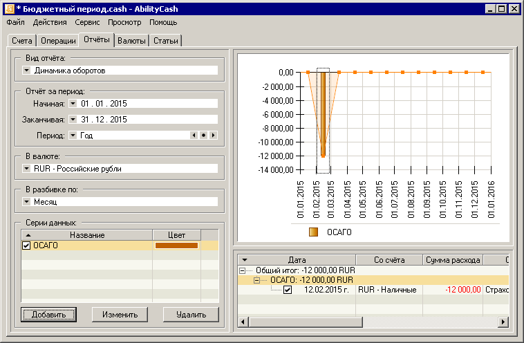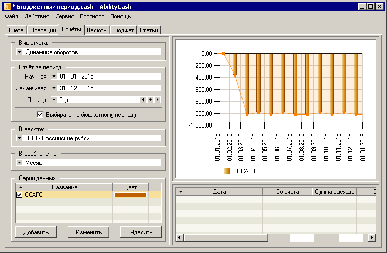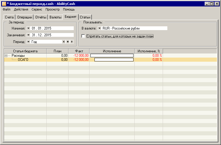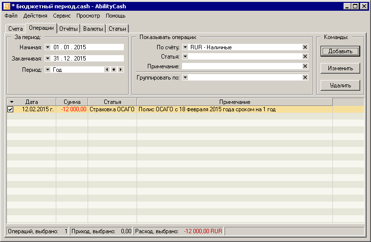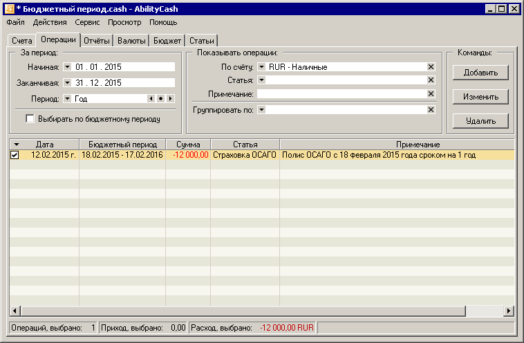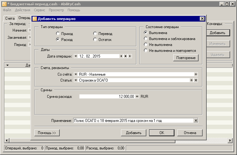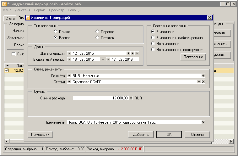 После этого в диалоге редактирования операции появятся новые поля, в которые должны вводиться дата начала и окончания нашего бюджетного периода. Ниже приведен пример заполнения этих полей для операции оплаты страховки, если полис ОСАГО будет действовать с 18 февраля 2015 года сроком на год: