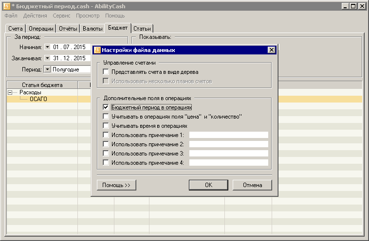 Прежде чем пользоваться бюджетными периодами, следует включить соответствующую настройку в файле данных. Для этого из меню «Файл» следует выбрать пункт «Настройки файла данных…» и в появившемся диалоговом окне отметить галочку «Бюджетный период в операциях»:
