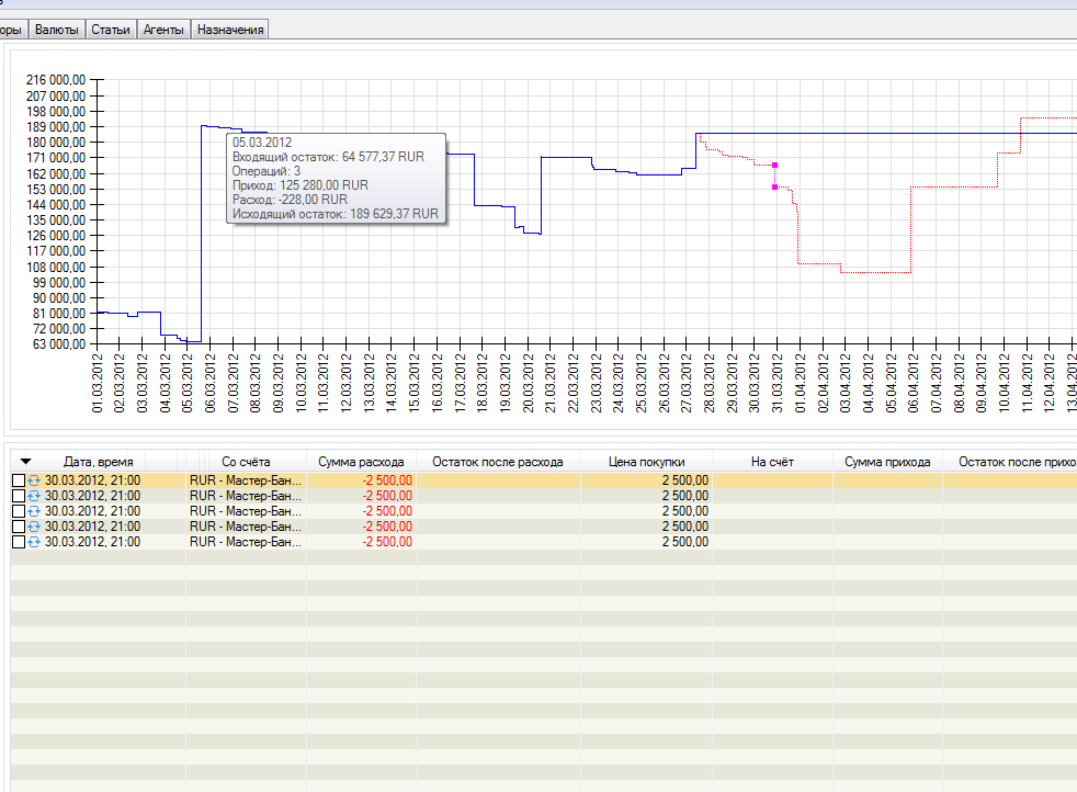 Однако, в 230-й версии я с удивлением обнаружил, что этот отчет показывает резкое увеличение расходов, просмотр операций по каждому такому расходу показал, что каждая запланированная повторяющаяся операция в день своего первого повторения в ближайшем будущем в отчете учитывается не один раз, а несколько. Причем последующие повторения считаются нормально, а вот первое размножается. Также обратил внимание, что количество повторов зависит от того как часто эта операция повторяется по расписанию. Т.е. ежемесячные списания например удваиваются, еженедельные фигурируют 5 раз вместо одного, а ежедневные раз 40 (точно не посчитал).