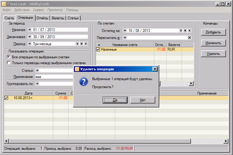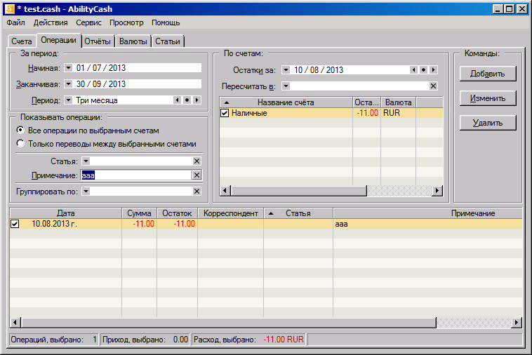 Закладка "Операции":