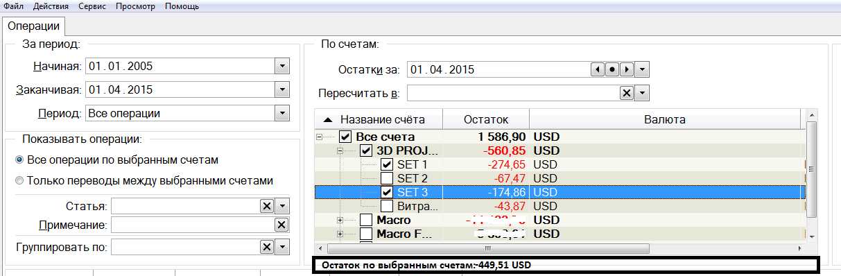 Добавить статусную строку (для области данных «По счетам:» окна «Операции») для отображения сквозной суммы остатков по выбранным счетам (группам счетов). Визуализированный пример прилагается.