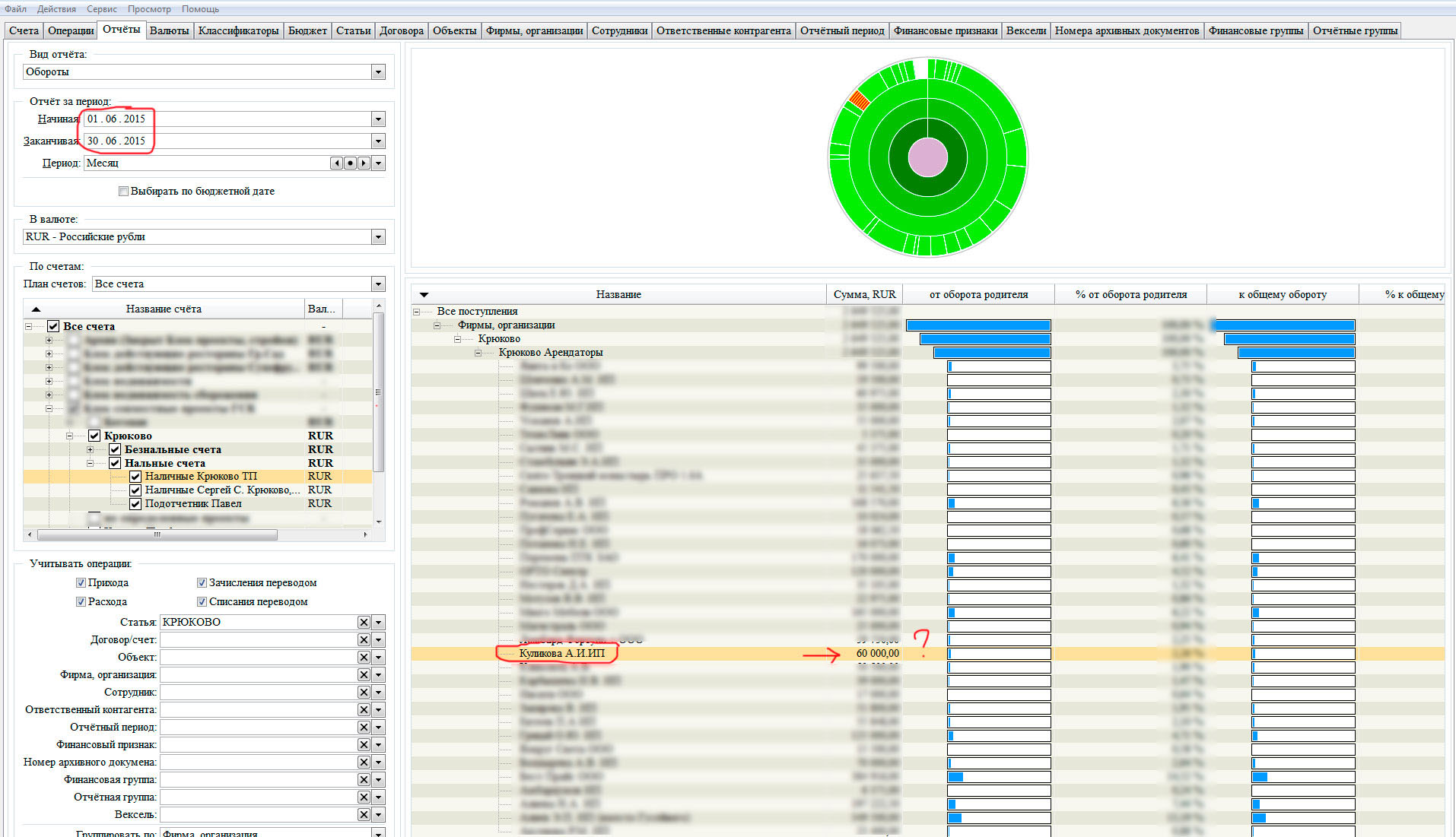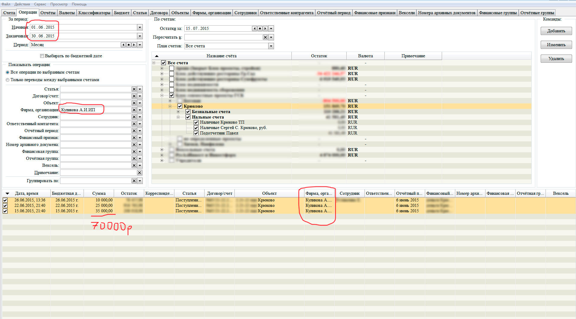 Разнятся суммы на закладках операции и отчеты. На скриншотах это отчетливо видно. Разница остается даже после сохранения и выхода из программы.