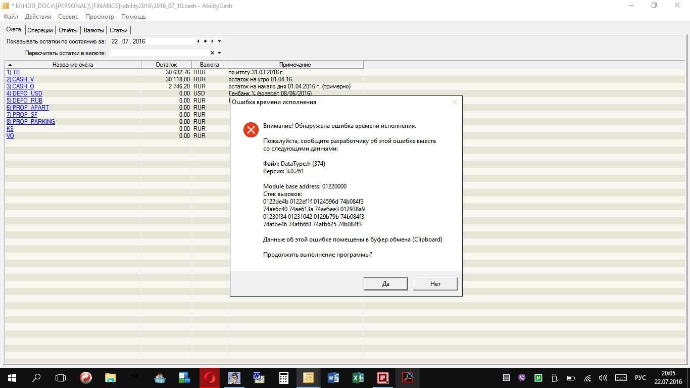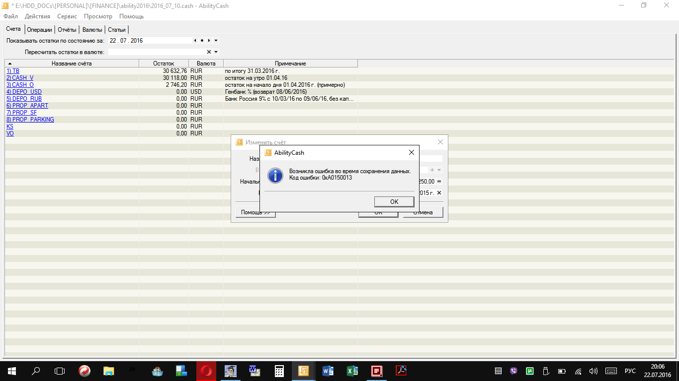 При попытке изменить начальный остаток по любому счету (базу создавал в апреле 2016 г.), а равно при внесении изменений в строку Примечание к счету выдает ошибку и не сохраняет изменения. Скриншот ошибки в файле ErrorCA_1 (в файле ErrorCA_2 последствия той же ошибки).
