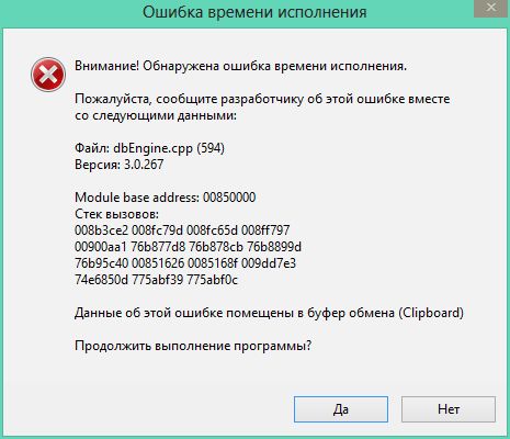 Возможно, при сетевой работе на одной базе данных, произошла ошибка времени исполнения, которая при каждой загрузке появляется на экране в виде прилагаемого изображения. Эта ошибка не исчезает при попытке отмены выполненных в этот день операций, при пересохранении под другим именем.