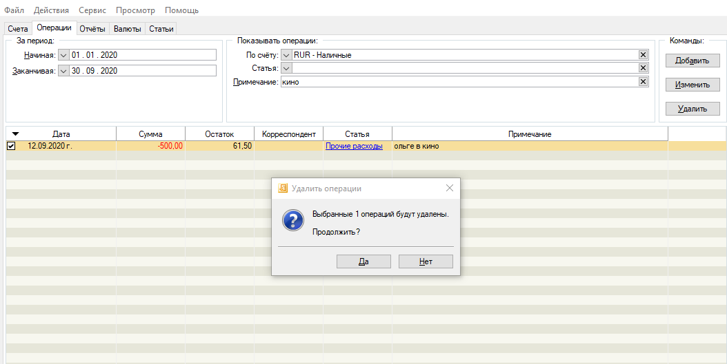 Когда в поле "Показывать операции" ставишь в Примечание фильтр из фразы, а потом выделяешь этот фильтр и пытаешься удалить кнопкой Delete, то удаляется не поле Примечание, а активная строка Операции, да, выскакивает предупреждающее окно, если его не прочитать и нажать ОК, то можно удалить операцию такую старую, что найти потом, что удалил будет очень трудно. Удаляю кнопкой Backspace, что не привычно, обычно все используют Delete. Разработчик, ну сделай ты кнопку Донат, ну реально же программа неплохая, пользуемся, может накидаем тебе по 100 рублей и ты хоть не глобально, но мелкие пожелания исполнишь :-). У меня скоро юбилей использования программы, 10 лет!