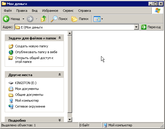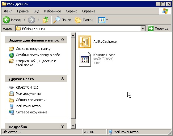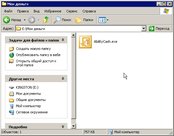 Вряд ли флеш-диск будет использоваться только для AbilityCash, поэтому создадим на флешке специальную папку для программы. На моем компьютере флешка подключена как диск E:\, а для программы создадим папку с названием "Мои деньги" так, как это видно на следующем снимке:
