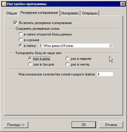 Запускаем программу и вызываем диалог настроек AbilityCash (пункт «Настройки...» из меню «Сервис»). В диалоге настроек открываем закладку «Резервное копирование» и заполняем поля настроек копирования: