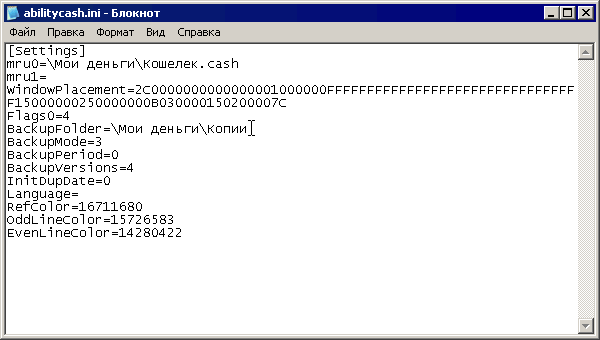 После этого закроем программу и откроем в блокноте файл AbilityCash.ini: