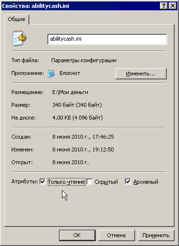 После этого изменение настроек программы в AbilityCash станет невозможным. По крайней мере до тех пор, пока не будет снят режим «Только для чтения» с файла настроек.