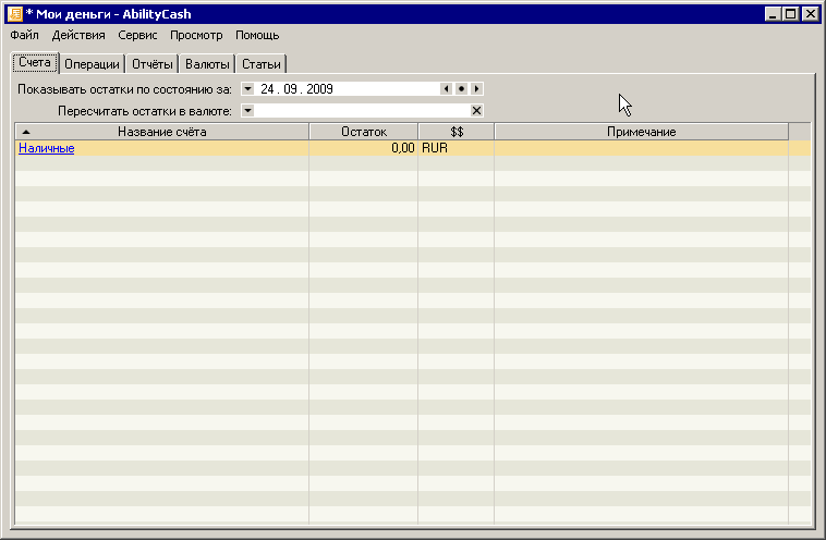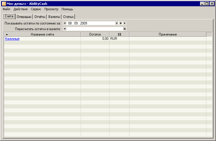 Запустите программу, дважды щелкнув мышкой на ее ярлыке. Вообще, всякий раз при запуске AbilityCash пытается открыть последний файл данных, с которым работала в прошлом сеансе. Но если программа запускается в первый раз, то она запустится с новым, пустым файлом данных: