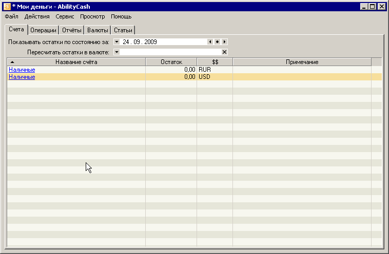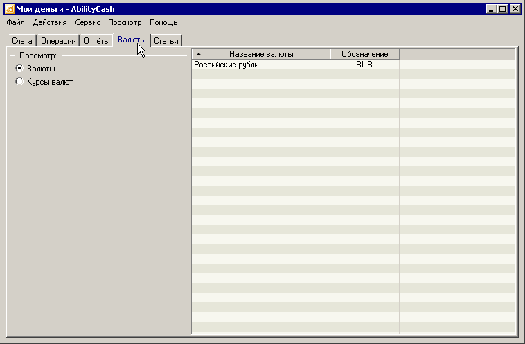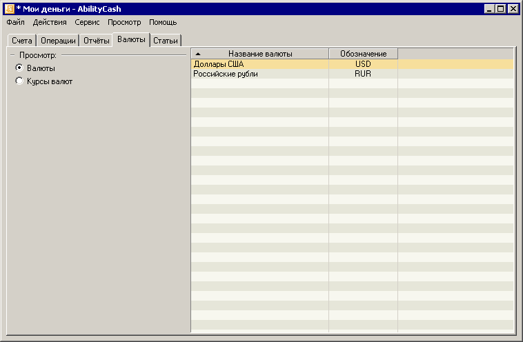 Закладки «Счета» и «Валюты» служат для просмотра и редактирования счетов и валют соответственно. Название закладки «Отчеты» должно говорить само за себя. Точно так же как и название «Операции».