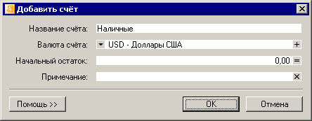 В этом окне вводим название счета "Наличные", после этого из выпадающего списка "Валюта счета" выбираем "USD - Доллары США", а поля "Начальный остаток" и "Примечание" оставляем без изменения. Вот что должно получиться: