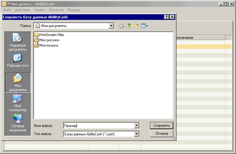 На экране компьютера должно появиться стандартное окно для выбора файла, в котором нужно указать название файла. Укажем название файла "Пример":